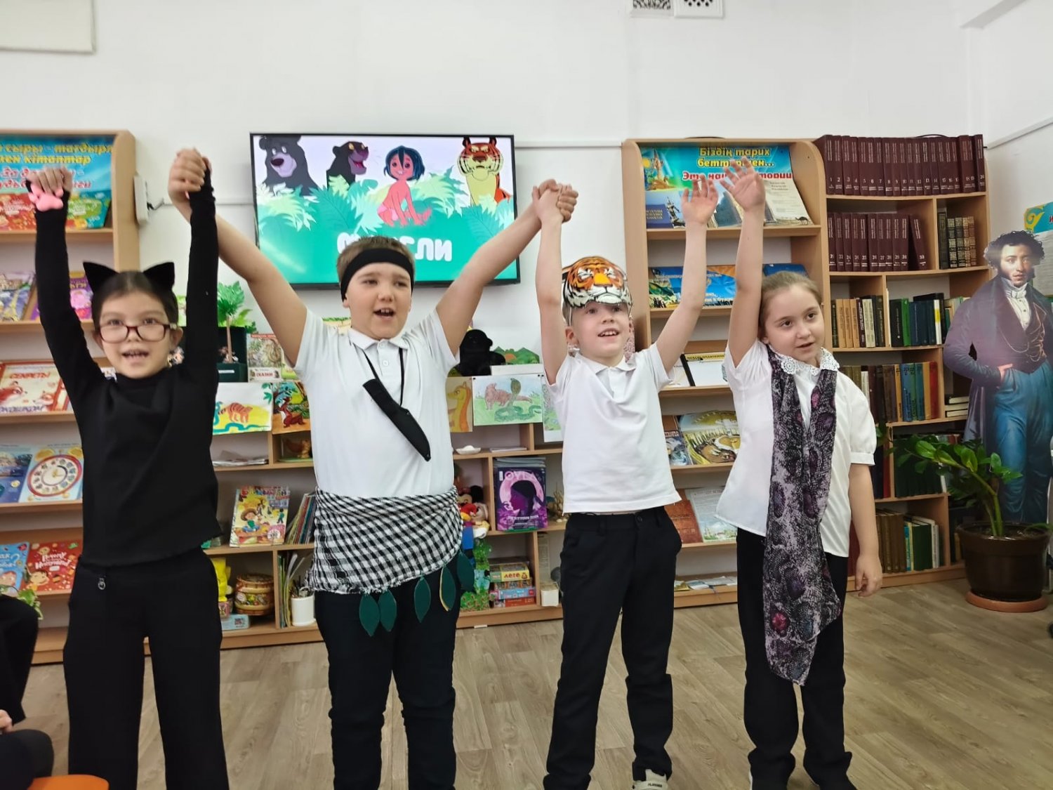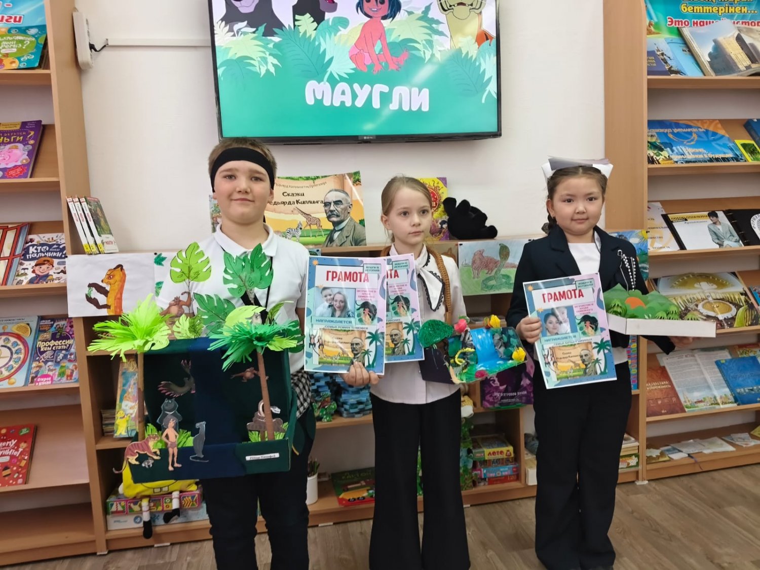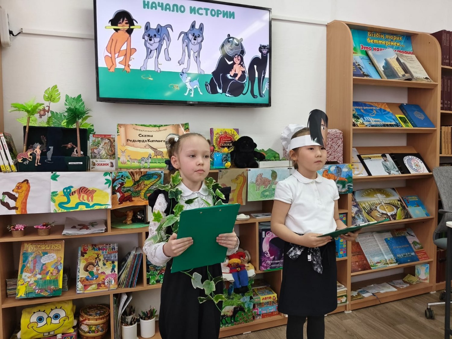 Балалар джунгли әлеміне саяхат жасап, оқиға кейіпкерлеріне айналды, көңілді көрініс қойып, викторина тапсырмаларын тамаша орындады! Кітап бетбелгілерін әкелген оқушылар тәтті сыйлықтарға ие болды. Ертегі бойынша қолөнер бұйымдарын дайындаған отбасылар лайықты грамоталармен марапатталды. Шара соңында барлық қатысушыларға тәттілер таратылды.
