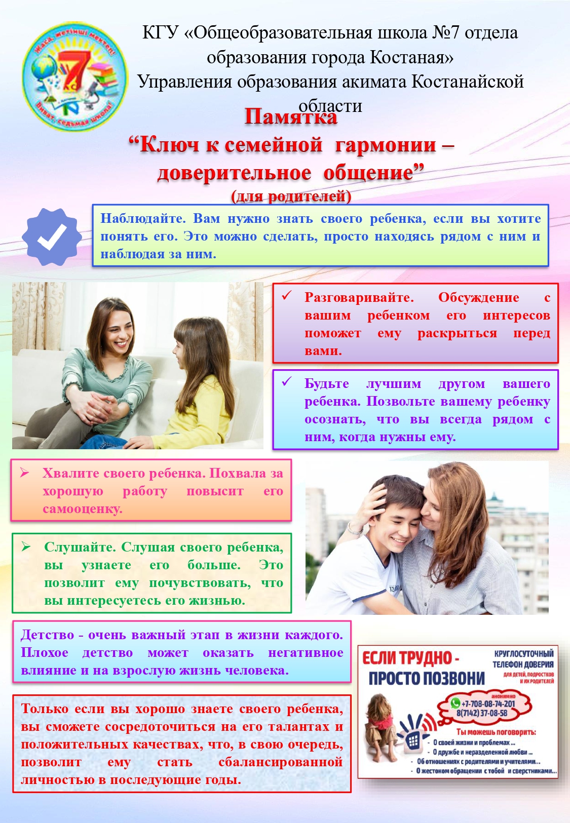 Памятка “Ключ к семейной гармонии – доверительное общение” (для родителей)