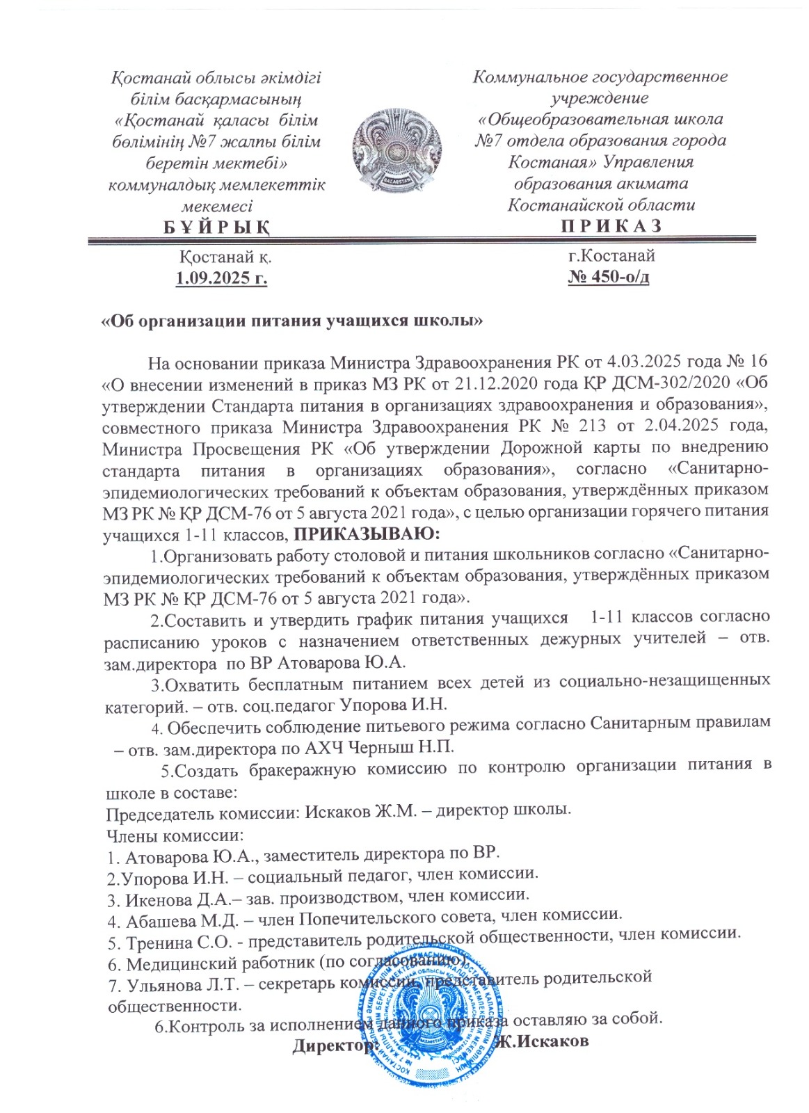 отдела образования города Костаная"