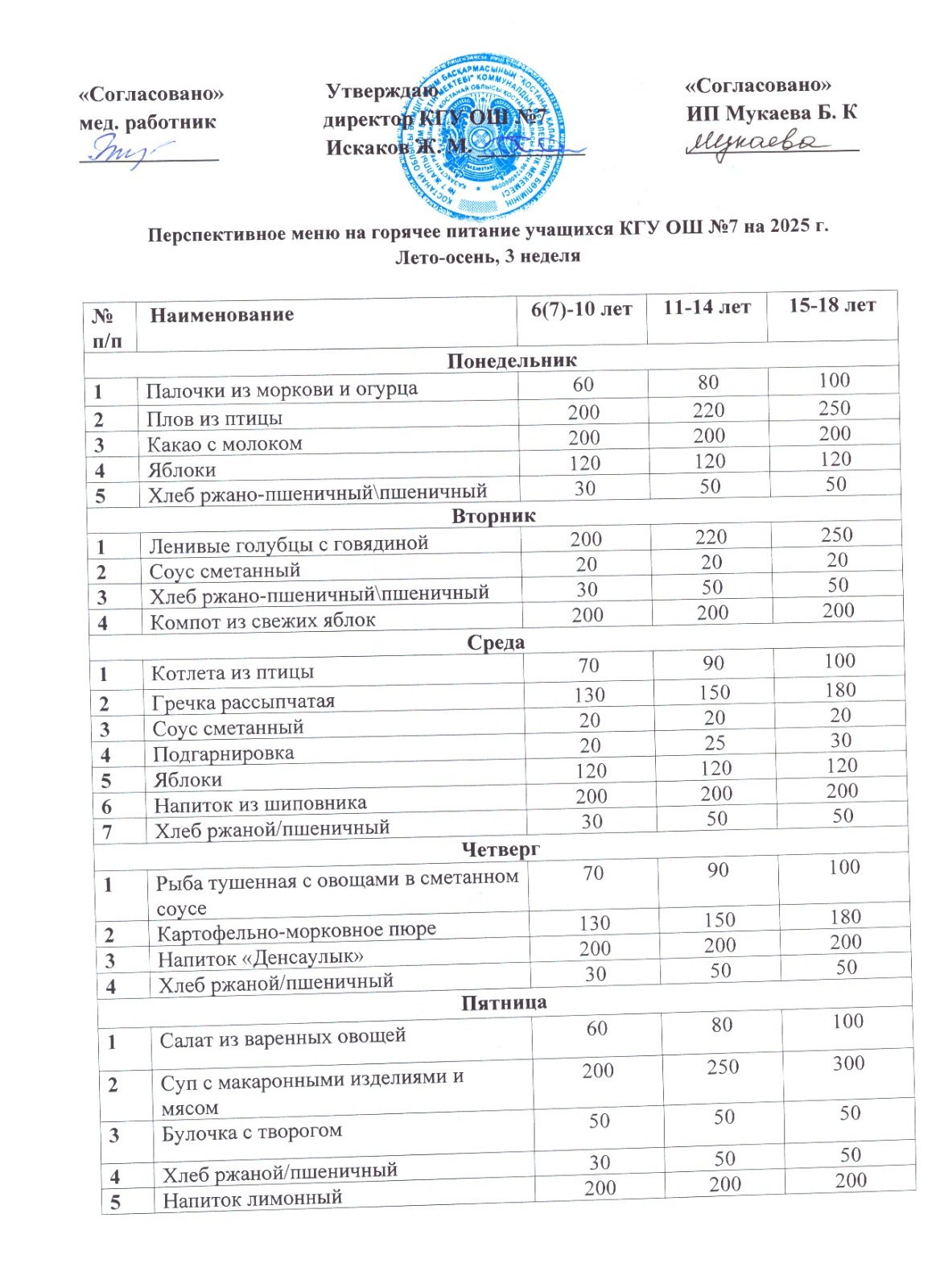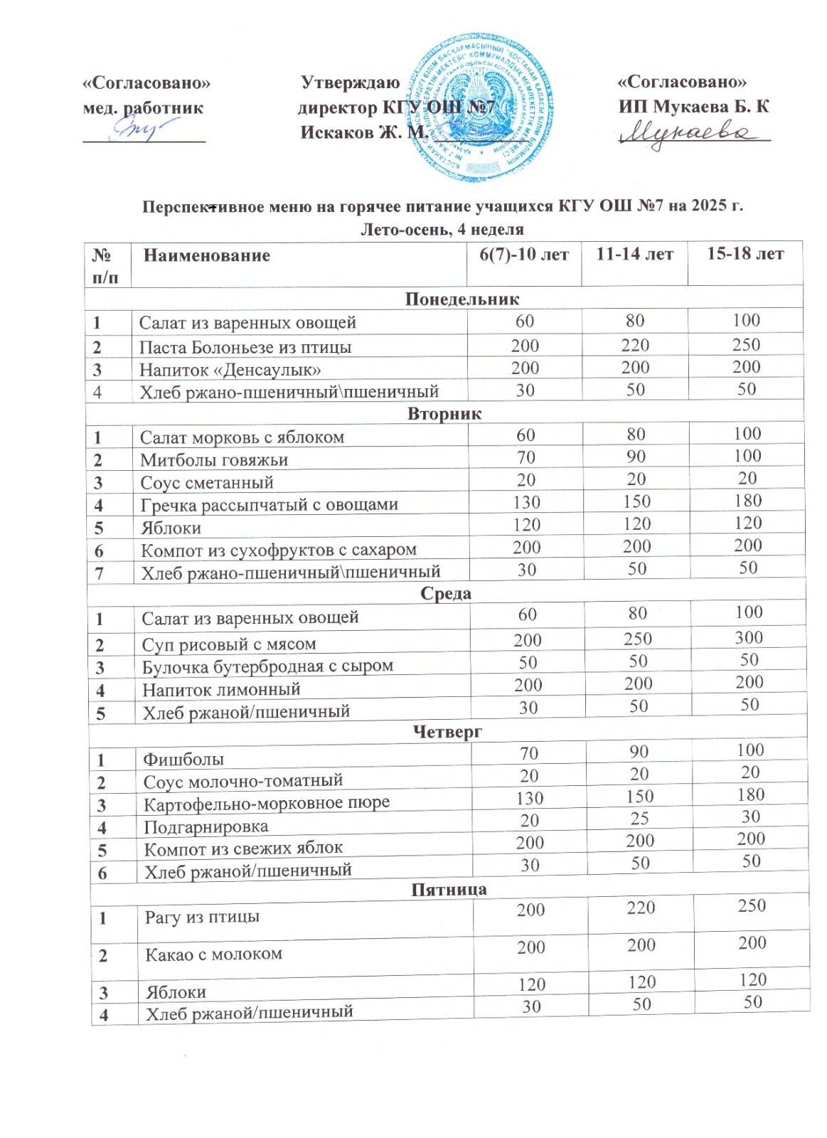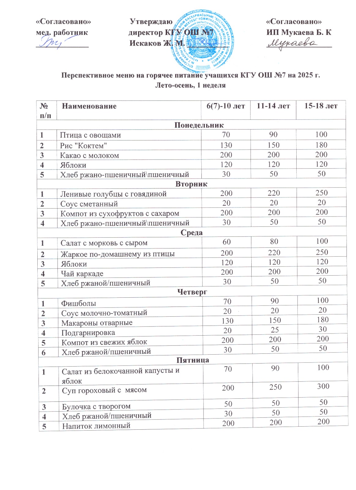 Перспективное меню на горячее питание учащихся КГУ ОШ№7 на 2025 учебный год. Лето-осень