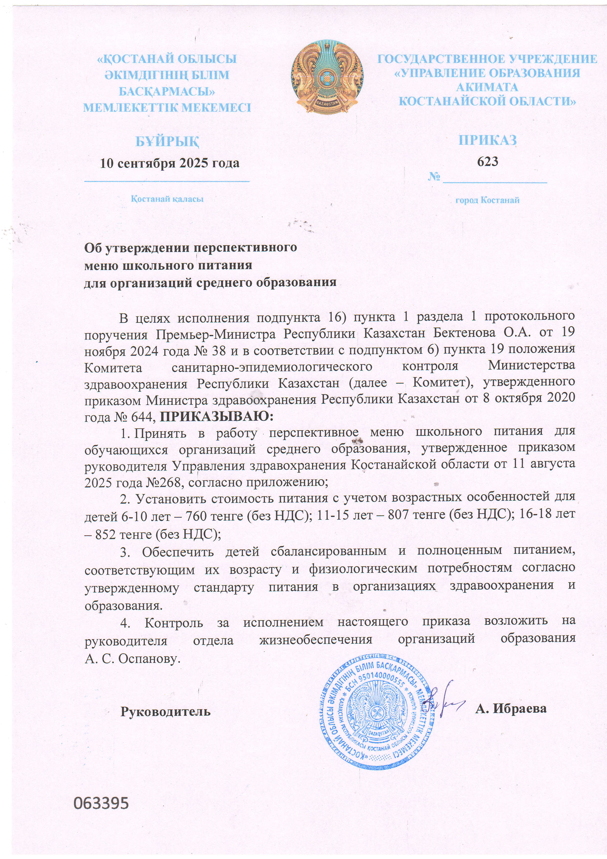 Об утверждении перспективного меню школьного питания для организаций среднего образования