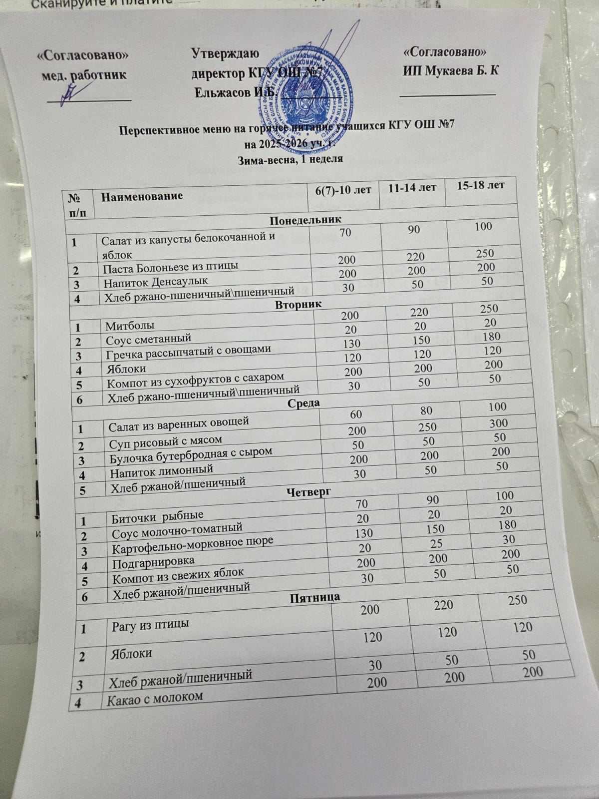 Перспективное меню на горячее питание учащихся КГУ ОШ№7 на 2025-26 учебный год. Зима-весна