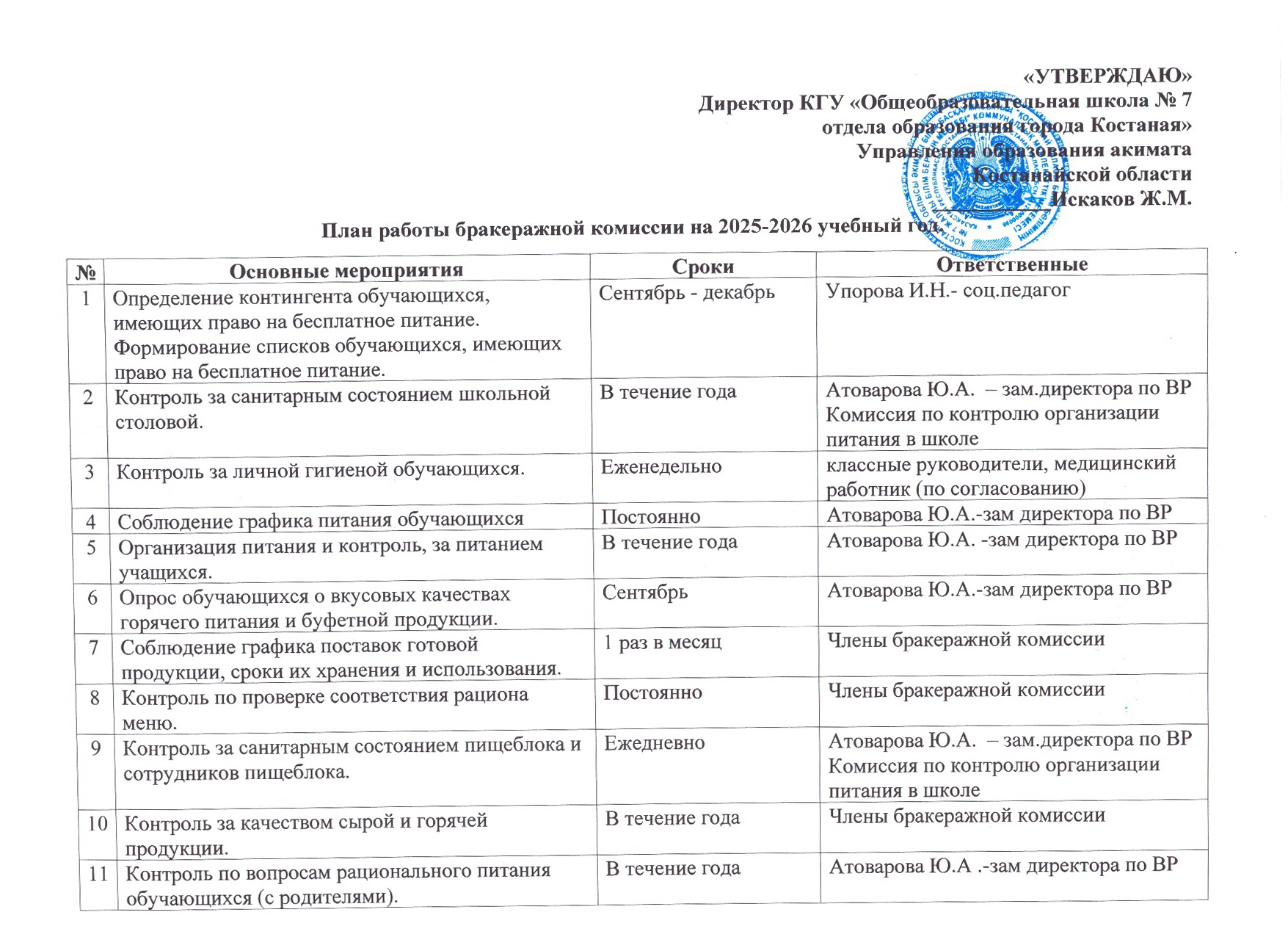 План работы бракеражной комиссии на 2025-2026 учебный год