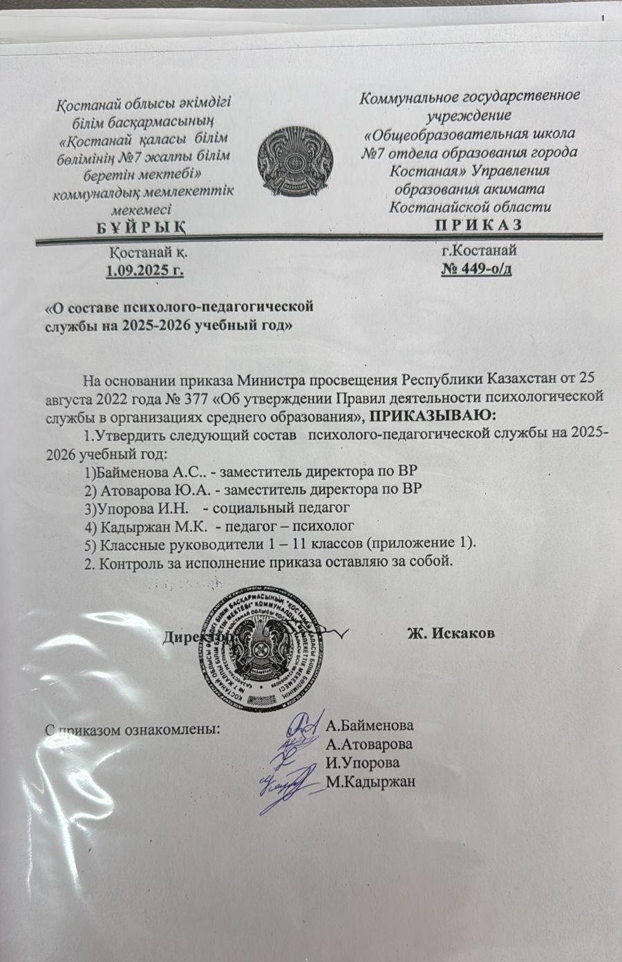О составе психолого-педагогической службы на 2025-2026 учебный год