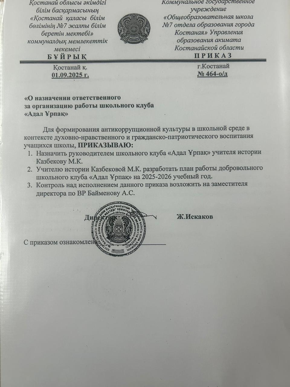 О назначении ответственного за организацию работы школьного клуба «Адал Ұрпақ»